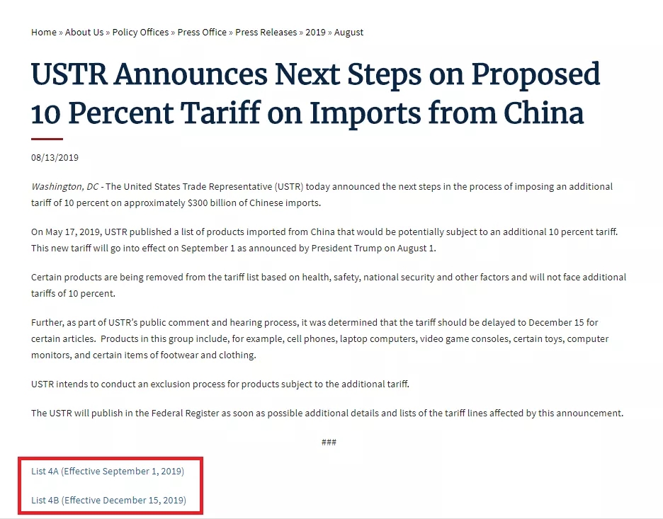 當地時間8月13日,USTR公布了對約3000億美元中國輸美產品加征10%關稅的最終清單,其中一份征稅清單于9月1日生效、另一份征稅清單于12月15日生效。