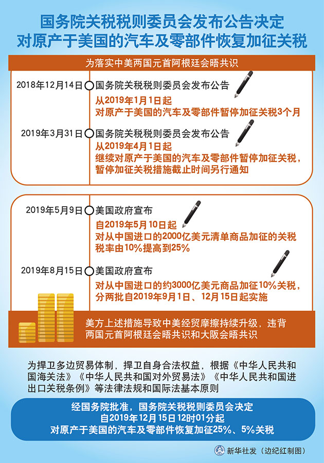 為捍衛(wèi)多邊貿(mào)易體制,捍衛(wèi)自身合法權(quán)益,根據(jù)《中華人民共和國海關法》《中華人民共和國對外貿(mào)易法》《中華人民共和國進出口關稅條例》等法律法規(guī)和國際法基本原則,經(jīng)國務院批準,國務院關稅稅則委員會決定,自2019年12月15日12時01分起,對原產(chǎn)于美國的汽車及零部件恢復加征25%、5%關稅。