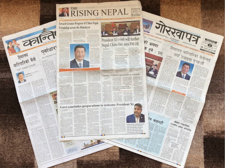10月11日,尼泊爾3份報紙頭版刊登習近平主席的署名文章,題為《將跨越喜馬拉雅的友誼推向新高度》。新華社記者王婧嬙攝