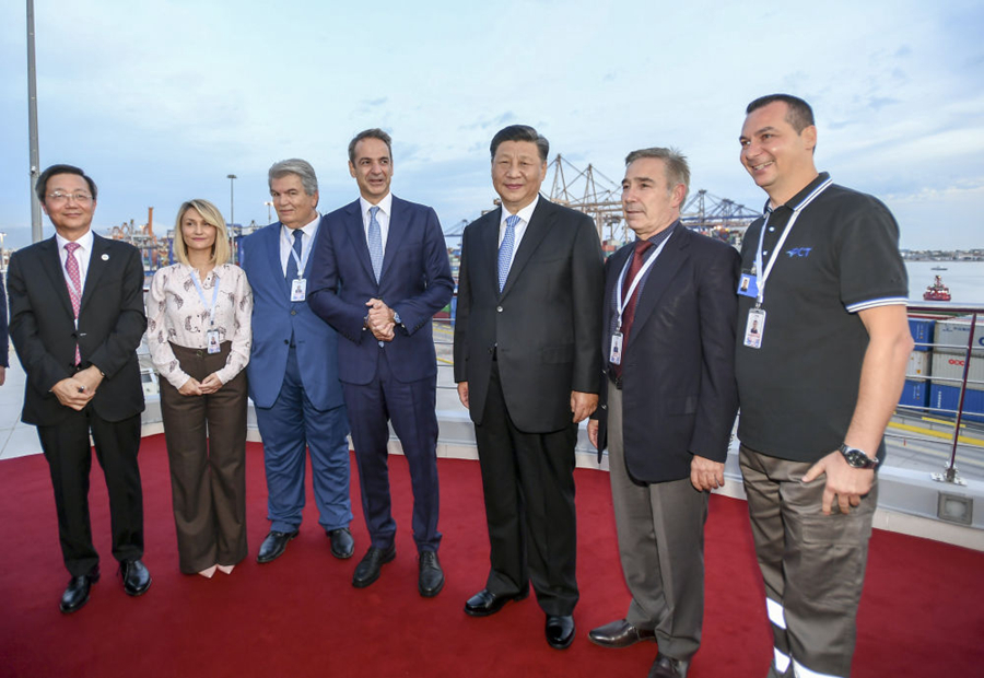 這是習(xí)近平和夫人彭麗媛同米佐塔基斯夫婦在港口樓頂平臺(tái)合影。新華社記者謝環(huán)馳攝