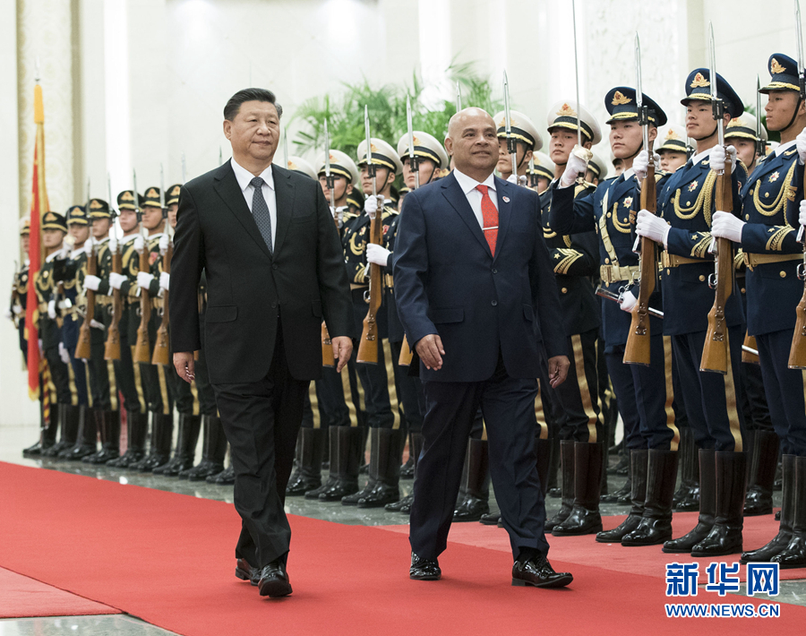 12月13日,國家主席習近平在北京人民大會堂同密克羅尼西亞聯邦總統帕努埃洛會談。這是會談前,習近平在人民大會堂北大廳為帕努埃洛舉行歡迎儀式。 新華社記者 王曄 攝