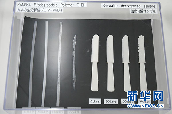 鐘化公司是日本一家知名化學品公司,記者日前前往鐘化公司的大阪總部,參觀了該公司研發(fā)的可降解聚合物“PHBH”。據(jù)介紹,這種可自然降解聚合物“PHBH”百分之百來源于植物,通過培養(yǎng)攝取植物油的微生物進行生產提取,可用于制造各種塑料制品,“PHBH”在自然界中可被多種微生物分解。鐘化公司還實物展示了“PHBH”塑料制品在海水中自然降解的不同階段,例如一根吸管在海水中90天幾乎可被自然降解殆盡。