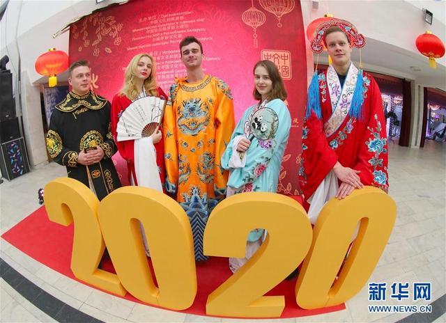 1月16日,在白俄羅斯首都明斯克,身著中國戲服的白俄羅斯人合影留念。 新華社發(任科夫攝)