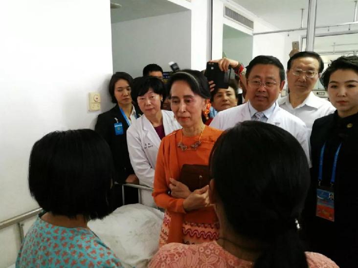 ▲2017年5月16日,緬甸國務資政昂山素季來到北京安貞醫院看望受救助在京做手術的緬甸先心病患兒。她在北京出席首屆“一帶一路”國際合作高峰論壇。新華社記者李雪笛攝