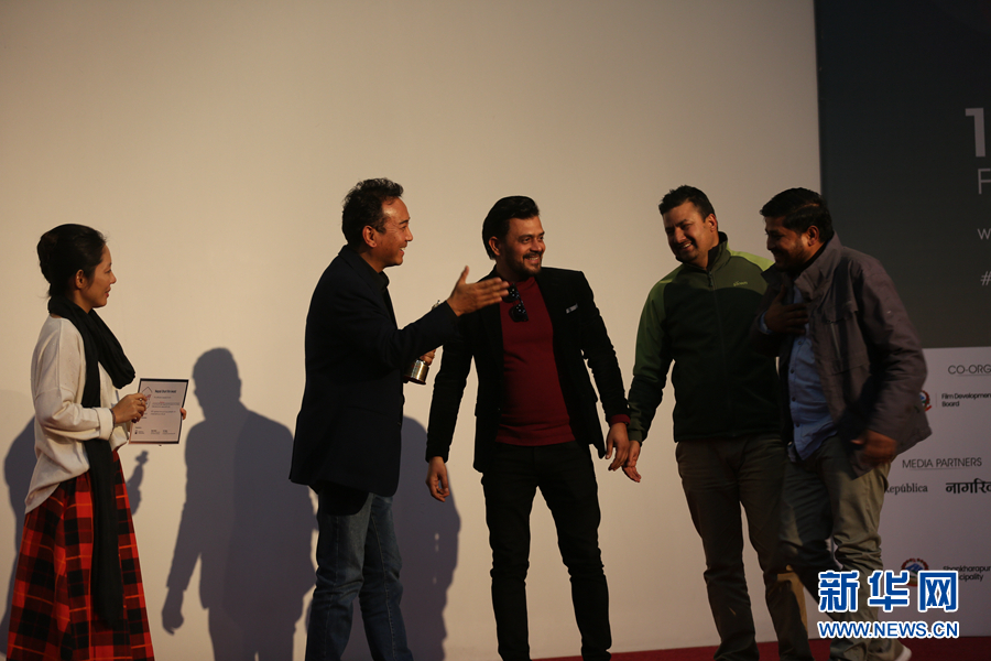2月17日,尼泊爾加德滿都市政大廳,在第三屆尼泊爾國際電影節的閉幕儀式上,頒獎嘉賓祝賀獲獎的電影制作團隊。本屆電影節2月13日開始,一共有來自40個國家和地區的80部影片入選,其中包括中國和哈薩克斯坦聯合拍攝的《音樂家》。記者 唐薇 攝