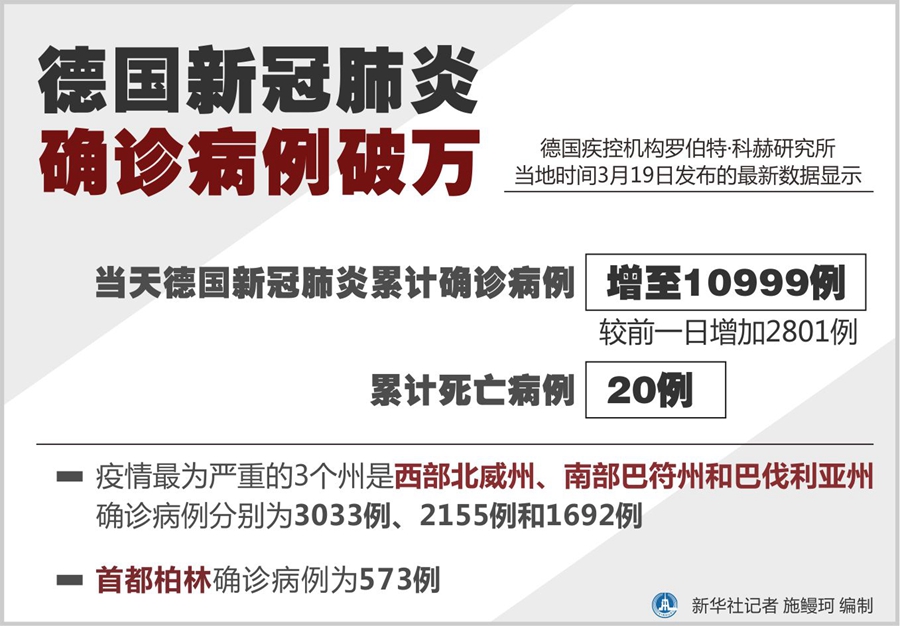 新華社柏林3月19日電(記者張毅榮 田穎)德國疾控機構羅伯特·科赫研究所19日發布的最新數據顯示,當天德國新冠肺炎累計確診病例增至10999例,較前一日增加2801例,累計死亡病例20例。
