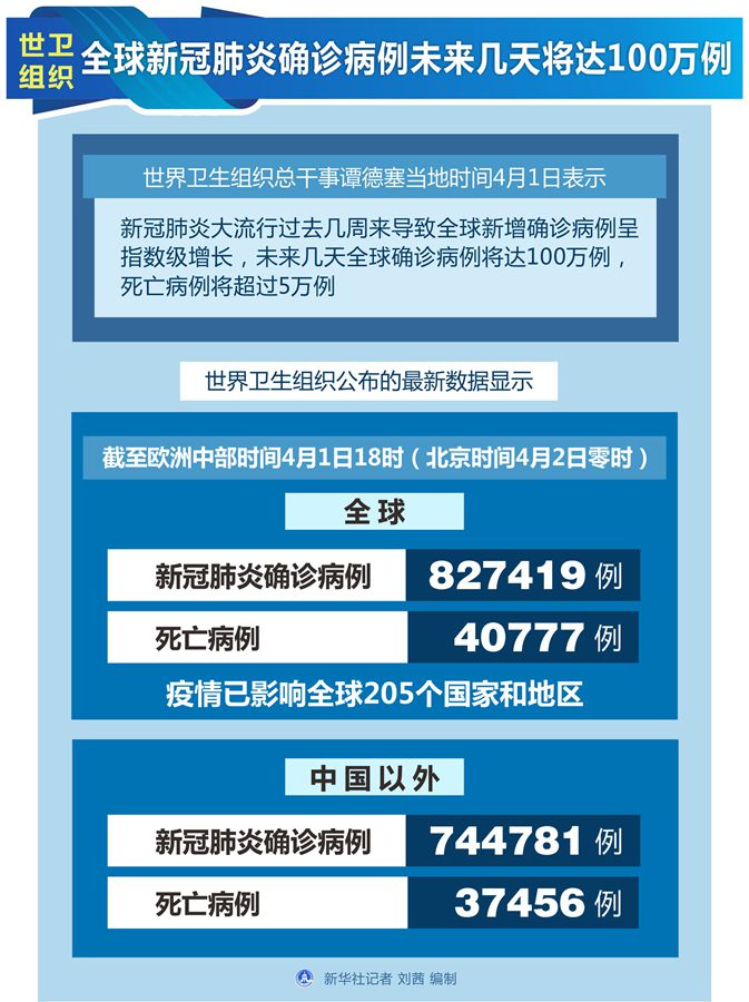 世衛(wèi)組織發(fā)布的最新數(shù)據(jù)顯示,截至歐洲中部時間1日18時(北京時間2日零時),全球新冠肺炎確診病例升至827419例,死亡病例40777例,疫情已影響到全球205個國家和地區(qū);中國以外新冠肺炎確診病例升至744781例,死亡病例37456例。