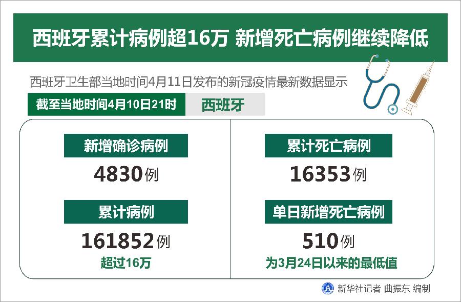 新華社馬德里4月11日電(謝宇智)西班牙衛(wèi)生部11日發(fā)布的新冠疫情最新數(shù)據(jù)顯示,截至當?shù)貢r間10日21時,西班牙新增確診病例4830例,累計病例數(shù)超過16萬,達到161852例;累計死亡病例達16353例,單日新增死亡病例510例,為3月24日以來的最低值。