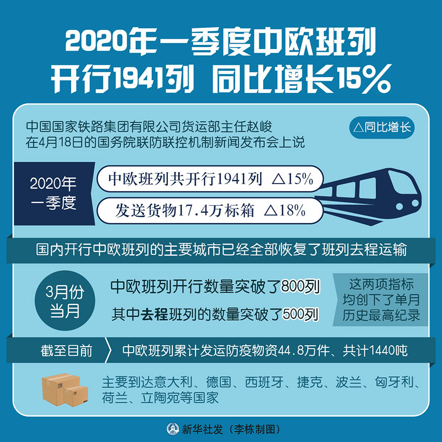新華社北京4月18日電(記者王希、于文靜)中國國家鐵路集團有限公司貨運部主任趙峻在18日的國務院聯防聯控機制新聞發布會上說,今年一季度,中歐班列共開行1941列,發送貨物17.4萬標箱,同比分別增長15%和18%。