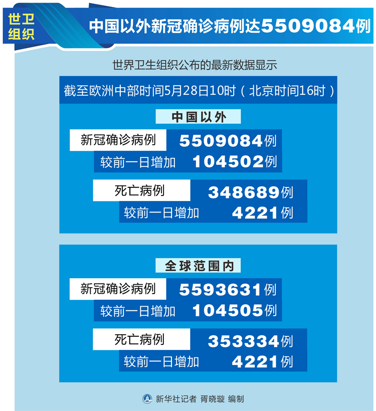 新華社日內瓦5月28日電(記者劉曲)世界衛生組織28日公布的最新數據顯示,中國以外新冠確診病例達到5509084例。