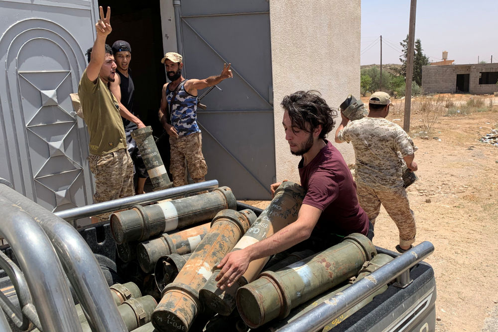 6月5日,利比亞民族團結(jié)政府武裝人員在奪回泰爾胡奈市后搬運沒收的武器。(新華社/路透)