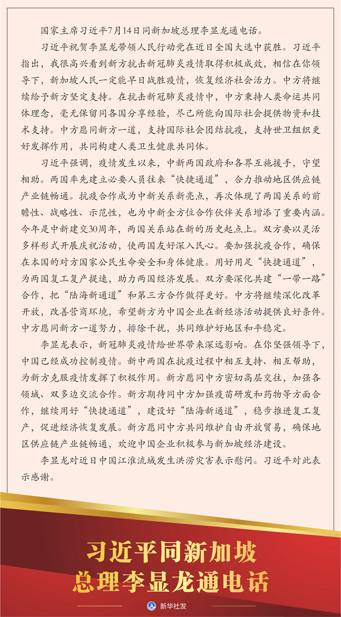 李顯龍表示,新冠肺炎疫情給世界帶來深遠影響。在你堅強領導下,中國已經成功控制疫情。新中兩國在抗疫過程中相互支持、相互幫助,為新方克服疫情發揮了積極作用。新方愿同中方密切高層交往,加強各領域、雙多邊交流合作。新方期待同中方加強疫苗研發和藥物等方面合作,繼續用好“快捷通道”,建設好“陸海新通道”,穩步推進復工復產,促進經濟恢復發展。新方愿同中方共同維護自由開放貿易,確保地區供應鏈產業鏈暢通,歡迎中國企業積極參與新加坡經濟建設。