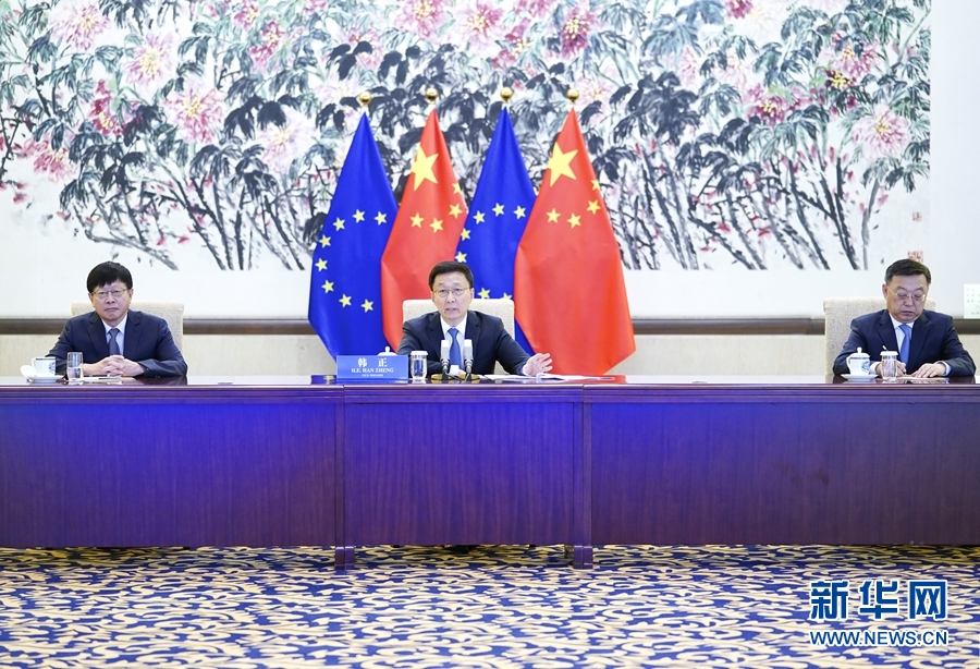 新華社北京7月29日電 中共中央政治局常委、國(guó)務(wù)院副總理韓正29日在北京同歐盟委員會(huì)第一副主席蒂默曼斯舉行視頻會(huì)見(jiàn)。