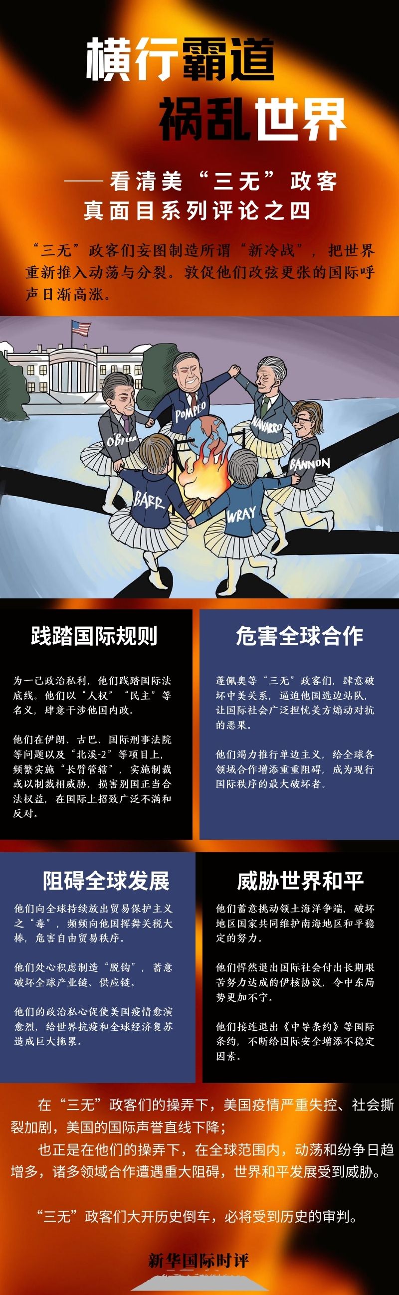 “三無”政客們的亂言與惡行,正在美國和國際上造成種種惡果。正是在他們的操弄下,美國疫情嚴(yán)重失控、社會撕裂加劇,美國的國際聲譽(yù)直線下降;也正是在他們的操弄下,在全球范圍內(nèi),動蕩和紛爭日趨增多,諸多領(lǐng)域合作遭遇重大阻礙,世界和平發(fā)展受到威脅。“三無”政客們大開歷史倒車,必將受到歷史的審判。