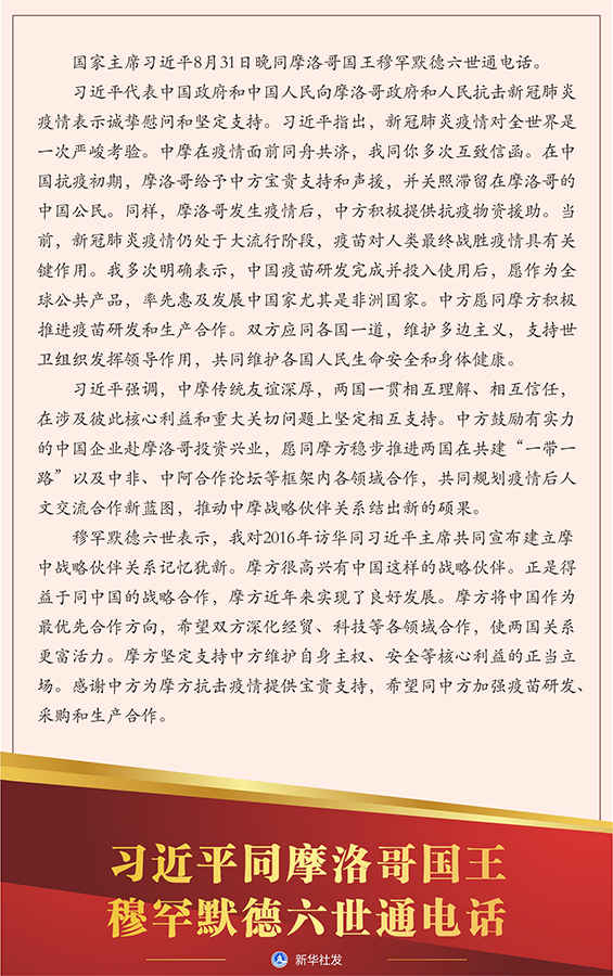 新華社北京8月31日電 國(guó)家主席習(xí)近平8月31日晚同摩洛哥國(guó)王穆罕默德六世通電話(huà)。