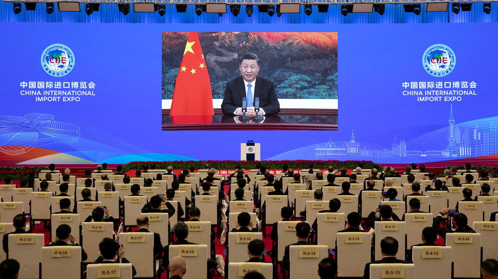 11月4日晚,習近平在第三屆中國國際進口博覽會開幕式上以視頻方式發表主旨演講。新華社記者 黃敬文 攝