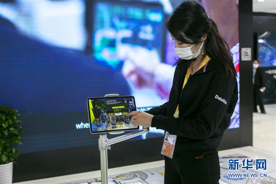 11月5日,在第三屆進(jìn)博會(huì)服務(wù)貿(mào)易展區(qū),德勤公司在中國首發(fā)“德勤小黃鴨智能工廠”,工作人員通過AR(增強(qiáng)現(xiàn)實(shí))技術(shù)展示智能工廠的應(yīng)用場(chǎng)景。 新華社記者 王翔 攝