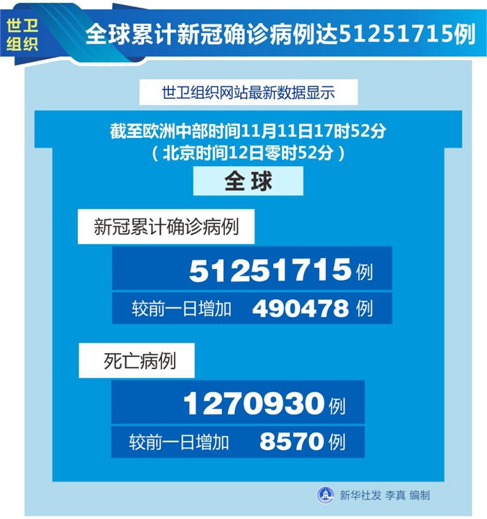 世衛組織網站最新數據顯示,截至歐洲中部時間11日17時52分(北京時間12日零時52分),全球確診病例較前一日增加490478例,達到51251715例;死亡病例增加8570例,達到1270930例。