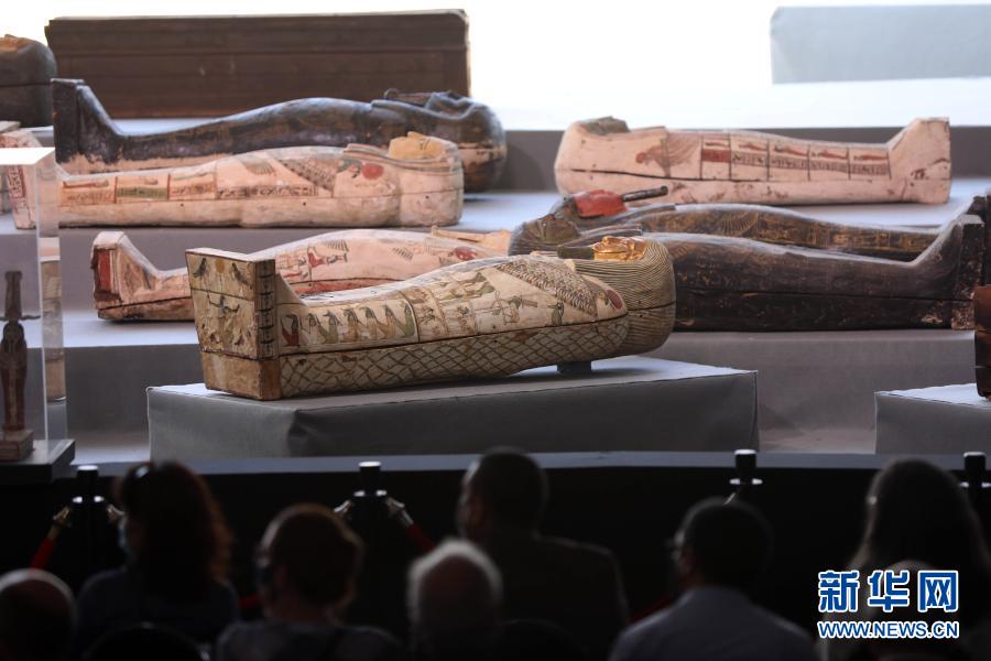 這是11月14日在埃及吉薩拍攝的彩繪木棺和其他出土文物。新華社發(fā)(艾哈邁德·戈馬攝)