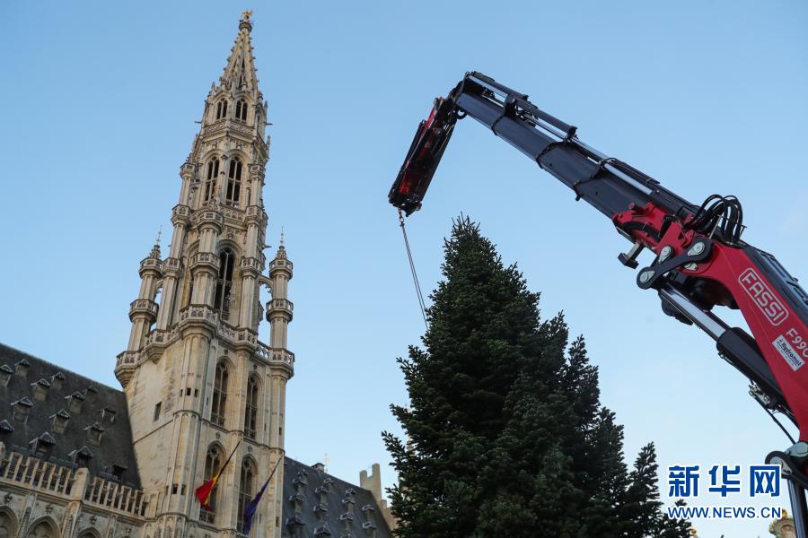 這是11月19日在比利時布魯塞爾大廣場拍攝的圣誕樹安裝現場。
