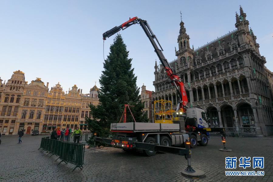 這是11月19日在比利時布魯塞爾大廣場拍攝的圣誕樹安裝現場。