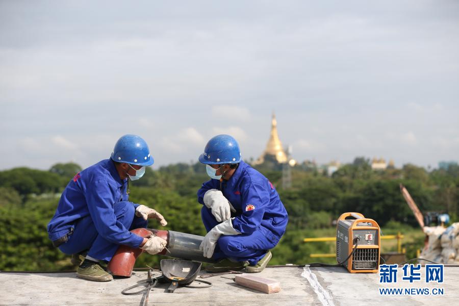 10月28日,在緬甸仰光的國家劇院維修改造項目現場,覺泰昂在師父的指導下焊接鋼管。新華社發(吳昂攝)
