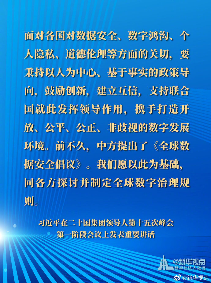 國家主席習近平21日晚在北京以視頻方式出席二十國集團領(lǐng)導人第十五次峰會第一階段會議并發(fā)表重要講話。以下是講話要點。