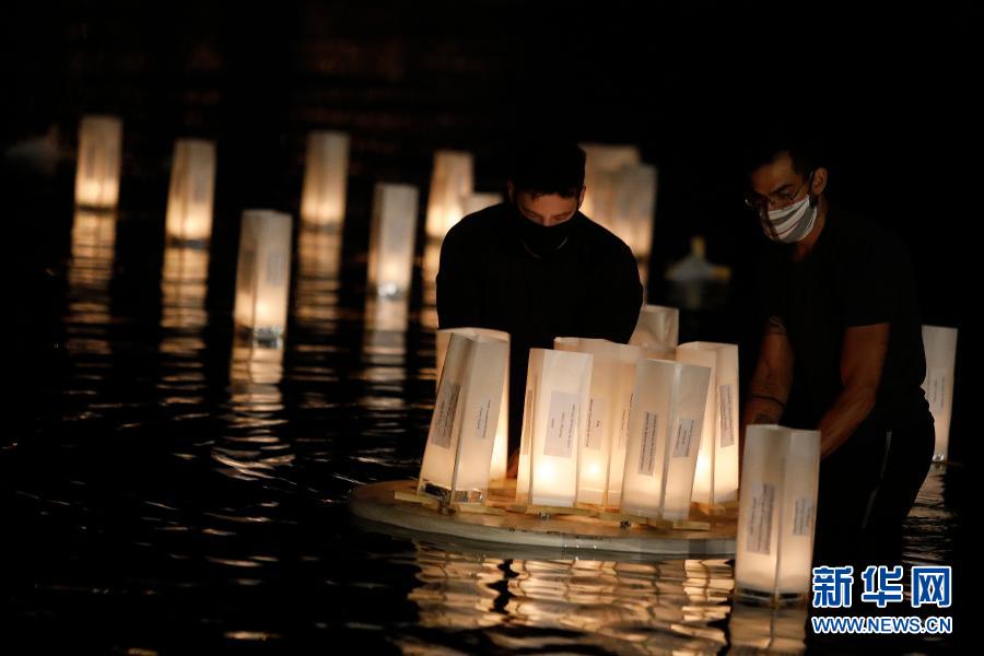 11月30日,在巴西首都巴西利亞,兩名男子往湖中放入水燈。新華社發(盧西奧·塔沃拉攝)