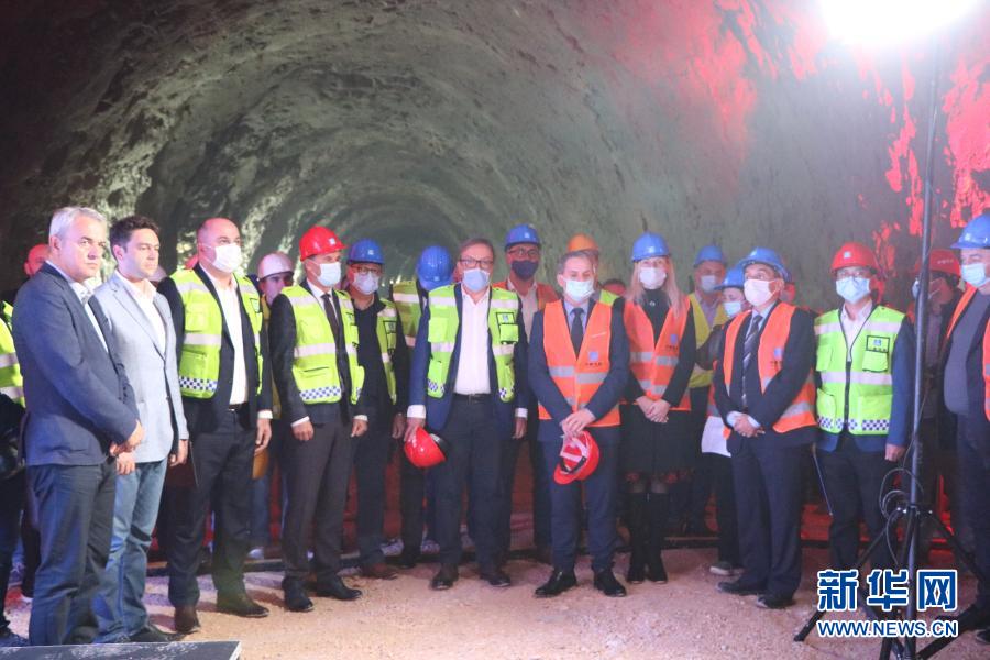 10月21日,在波黑泛歐5C走廊高速公路波契泰利隧道,中國施工方與波黑政府及業主方在隧道貫通后合影留念。新華社發(中建公司供圖)