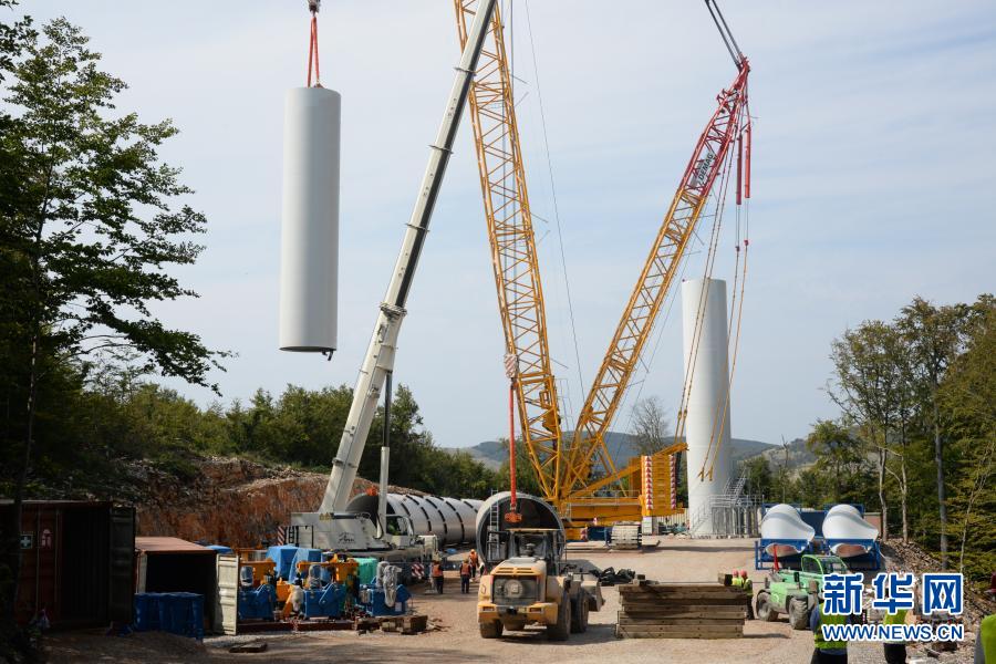 這是9月16日拍攝的克羅地亞塞尼風電項目風機塔筒吊裝施工現場。新華社記者 高磊 攝
