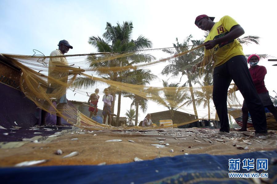 12月12日,在斯里蘭卡首都科倫坡附近的莫勒圖沃,漁民在海邊整理漁網。