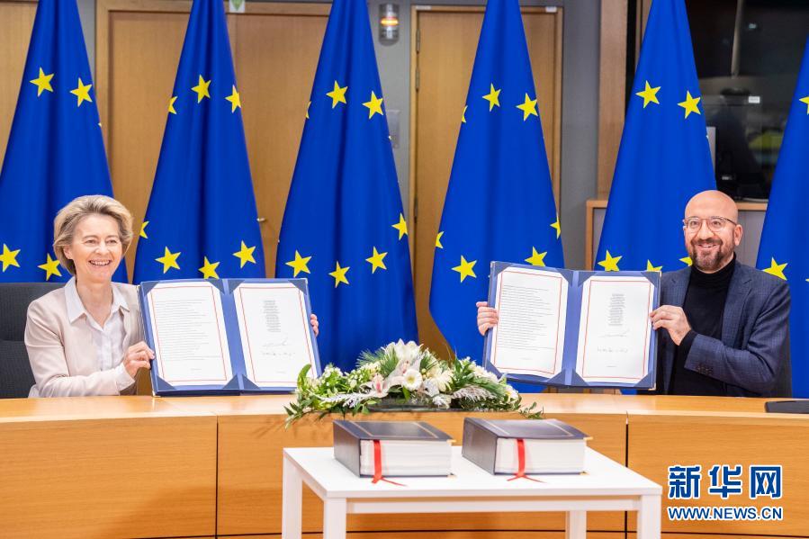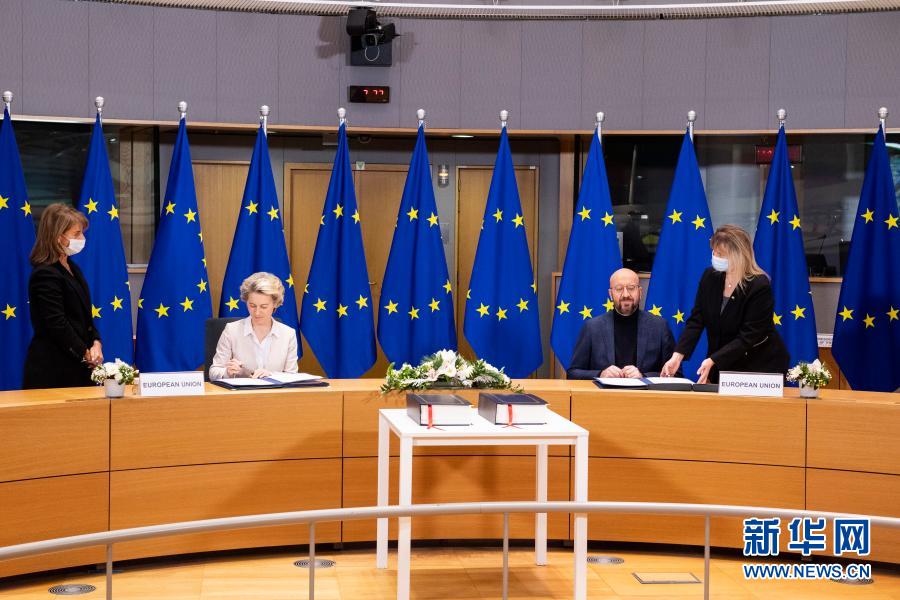 12月30日,在比利時布魯塞爾的歐盟總部,歐洲理事會主席米歇爾(右)和歐盟委員會主席馮德萊恩(左)出席簽署儀式。新華社發(fā)(歐盟供圖)