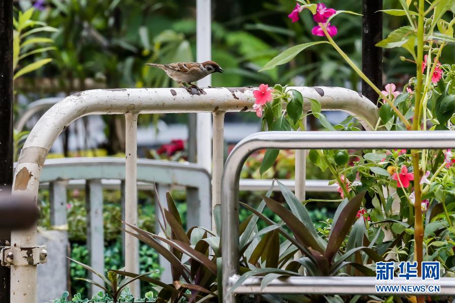 3月18日,在位于馬尼拉的菲律賓大學附屬菲律賓總醫院,一只麻雀站在“低語的花床”藝術裝置上。