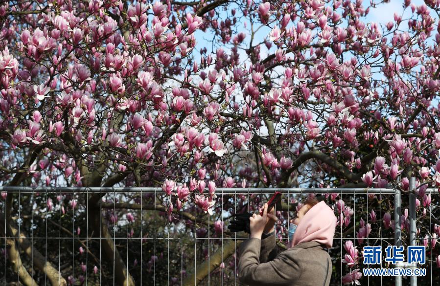 3月19日,在法國巴黎埃菲爾鐵塔腳下的戰神廣場,一名女子拍攝玉蘭花。新華社記者高靜攝