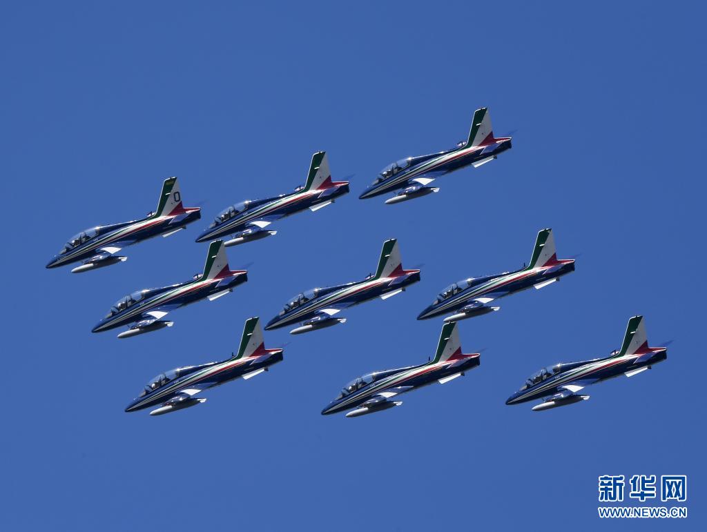 當日,意大利“三色箭”飛行表演隊在意大利首都羅馬舉行飛行表演,慶祝意大利空軍建立98周年。