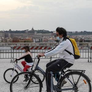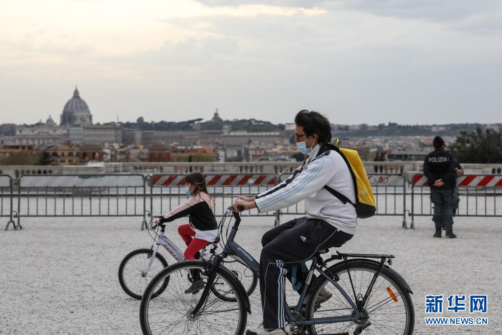 4月3日,人們騎車經過意大利羅馬的蘋丘觀景臺。