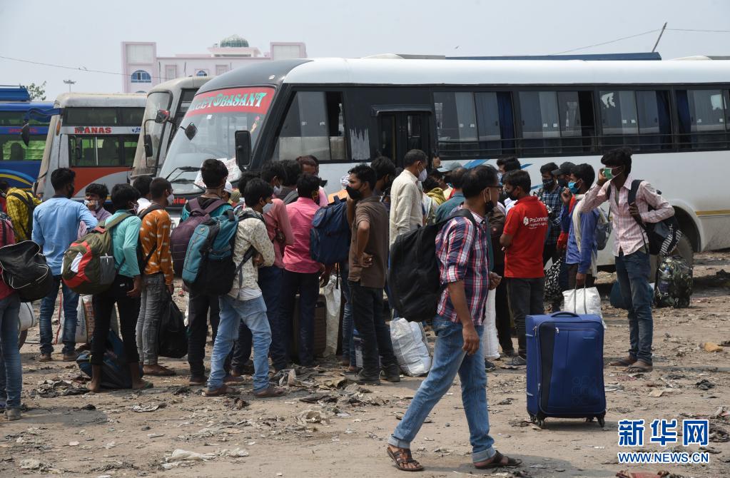 5月5日,印度比哈爾邦宣布實(shí)施封鎖措施后,人們?cè)谟《劝吞啬瞧囌緶?zhǔn)備乘坐巴士返回家鄉(xiāng)。
