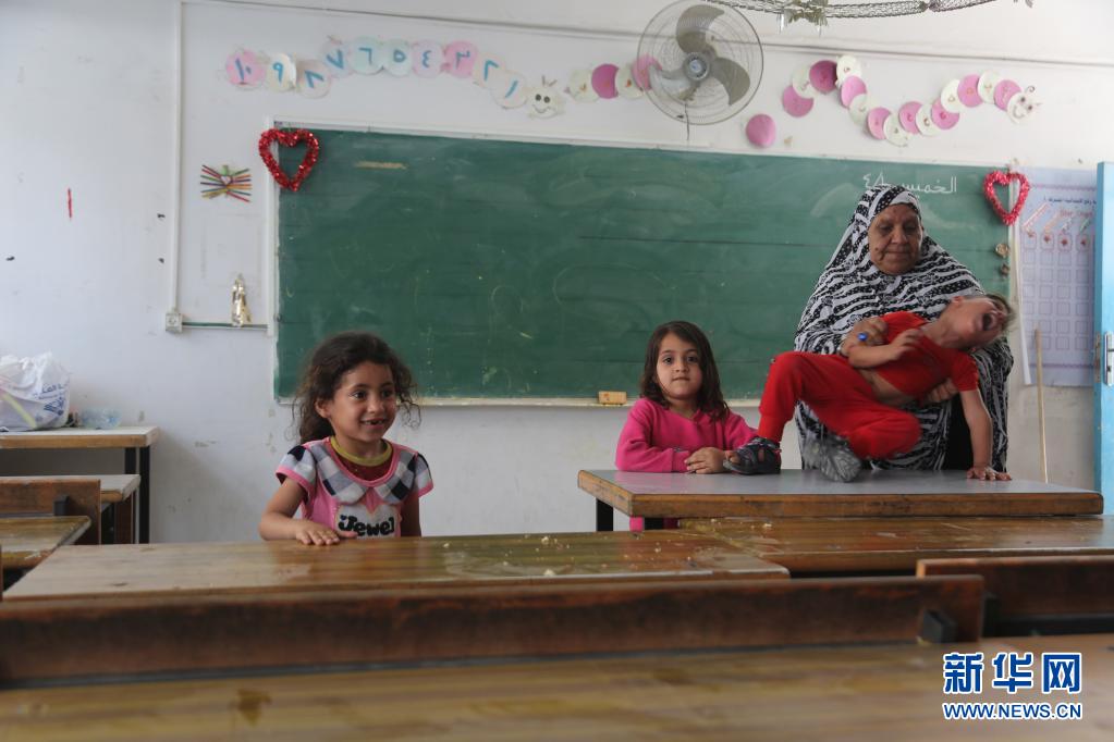 5月17日,受巴以沖突影響而逃離家園的巴勒斯坦婦女和兒童在加沙地帶拉法的一所學校臨時棲身。