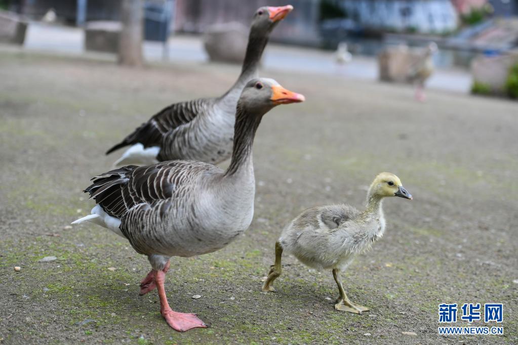 5月19日,幾只灰雁在德國法蘭克福的美茵河畔覓食。