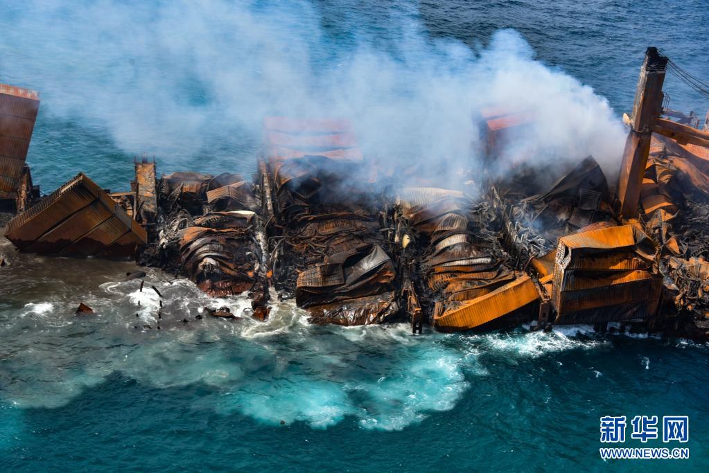 這是6月2日在斯里蘭卡科倫坡港附近拍攝的逐漸下沉的起火貨船“X-PRESS PEARL”號(hào)。