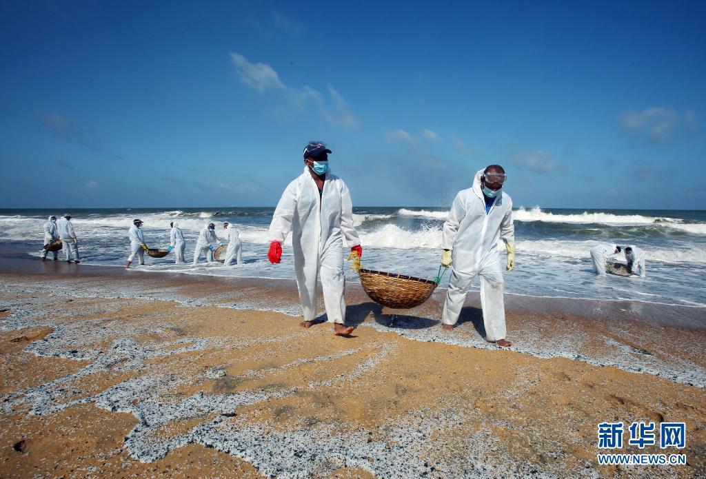 6月2日,工作人員在斯里蘭卡科倫坡一處沙灘清理貨船燃燒產生的廢物。