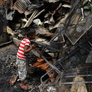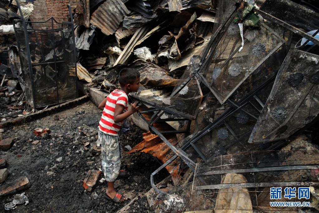 6月7日,一名兒童在孟加拉國首都達卡發生火災的貧民窟廢墟中尋找個人物品。