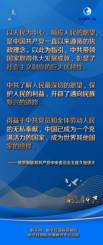 久加諾夫對中國共產黨百年華誕表示祝賀。回顧百年歷程,他表示,中共了解人民最深切的愿望,保護人民的利益,開辟了通向民族復興的道路。