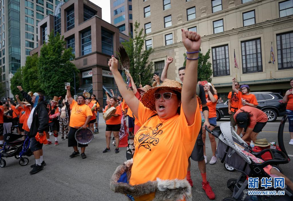 當天是加拿大日,上千名抗議者在溫哥華集會,悼念加拿大在強制“同化”原住民過程中遭到殘害的兒童,呼吁取消加拿大日的慶祝活動。