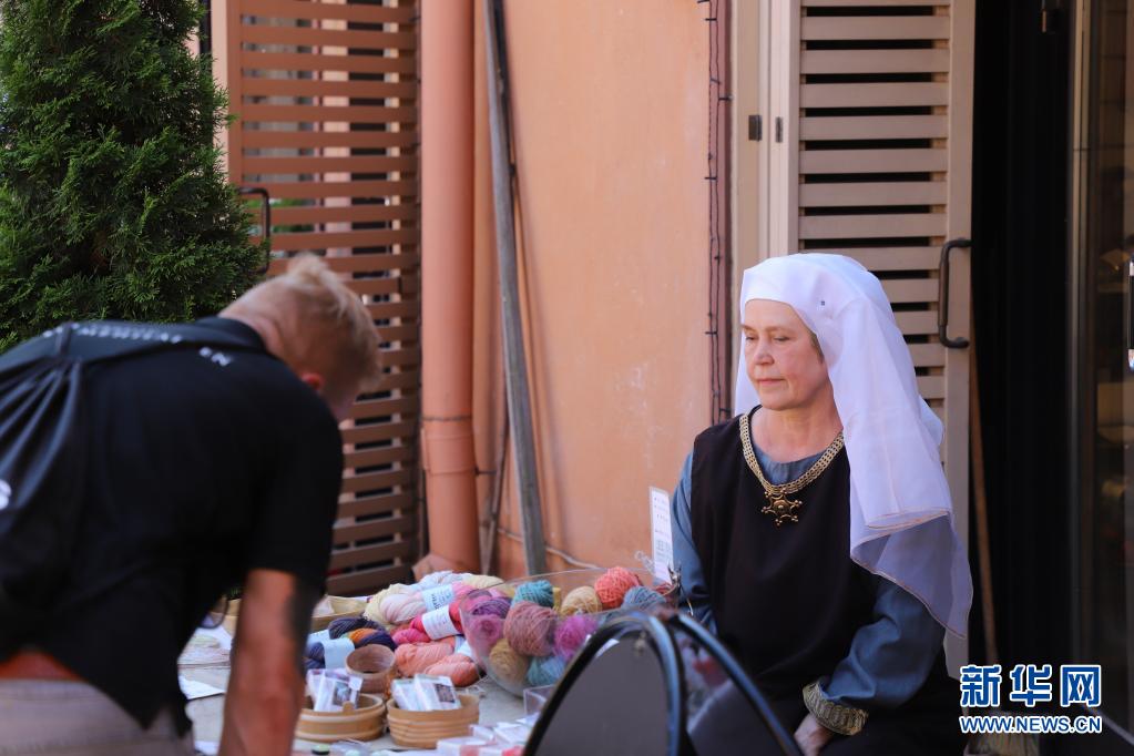 7月1日,一名身著中世紀(jì)風(fēng)格服裝的攤主在芬蘭圖爾庫(kù)舉行的“中世紀(jì)市集”上向顧客售賣紀(jì)念品。