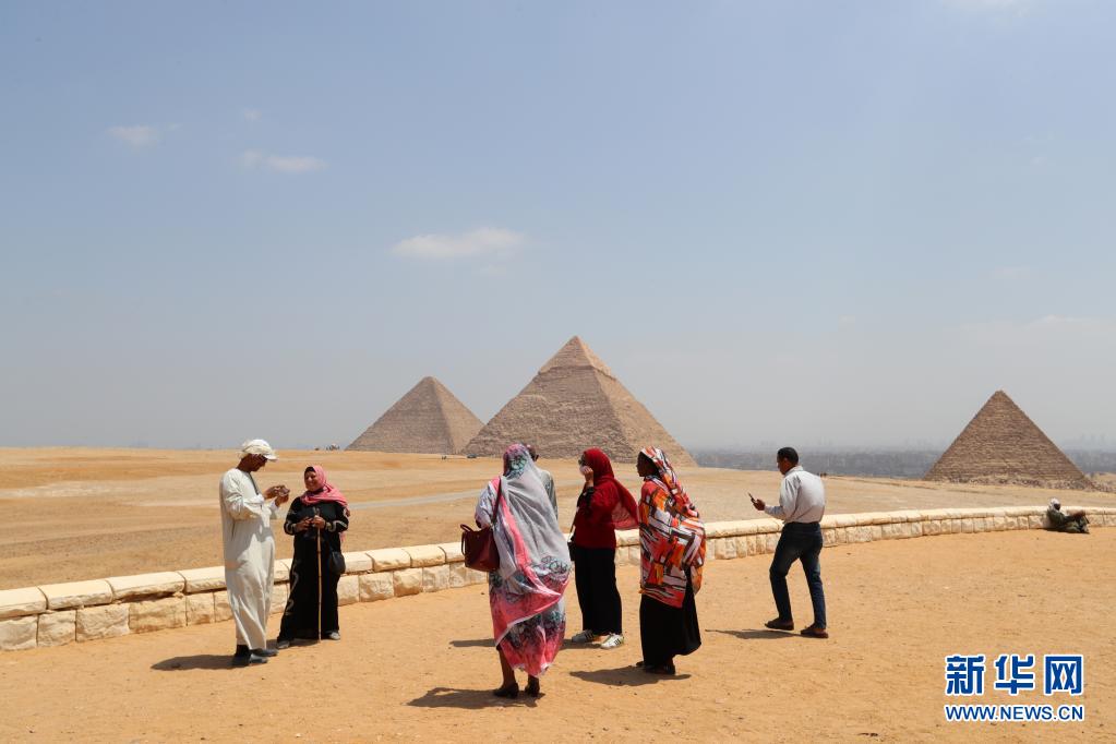 4月26日,游客在位于埃及吉薩省的金字塔群景區內游玩。